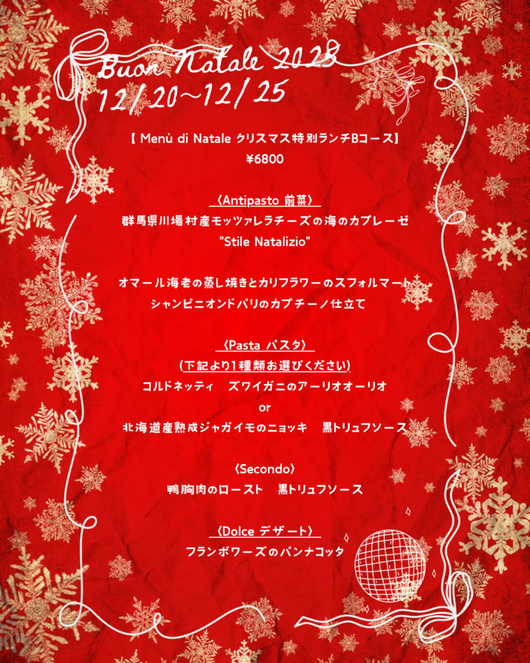 Lunch B course contents from December 22nd to 25th day Please check the contents on the website. (It is scheduled to be published in early November) Reservation for lunch is only for course. Please choose from A course or B course.