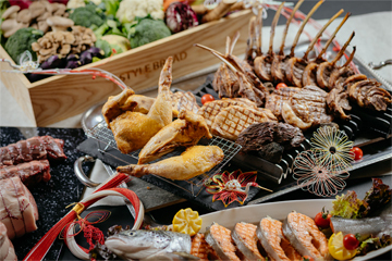 シェフが厳選したお肉に合う10種類以上のソースや塩をご用意。ビュッフェには、新年を彩るおせちや、デザート、ドリンクが並びます。