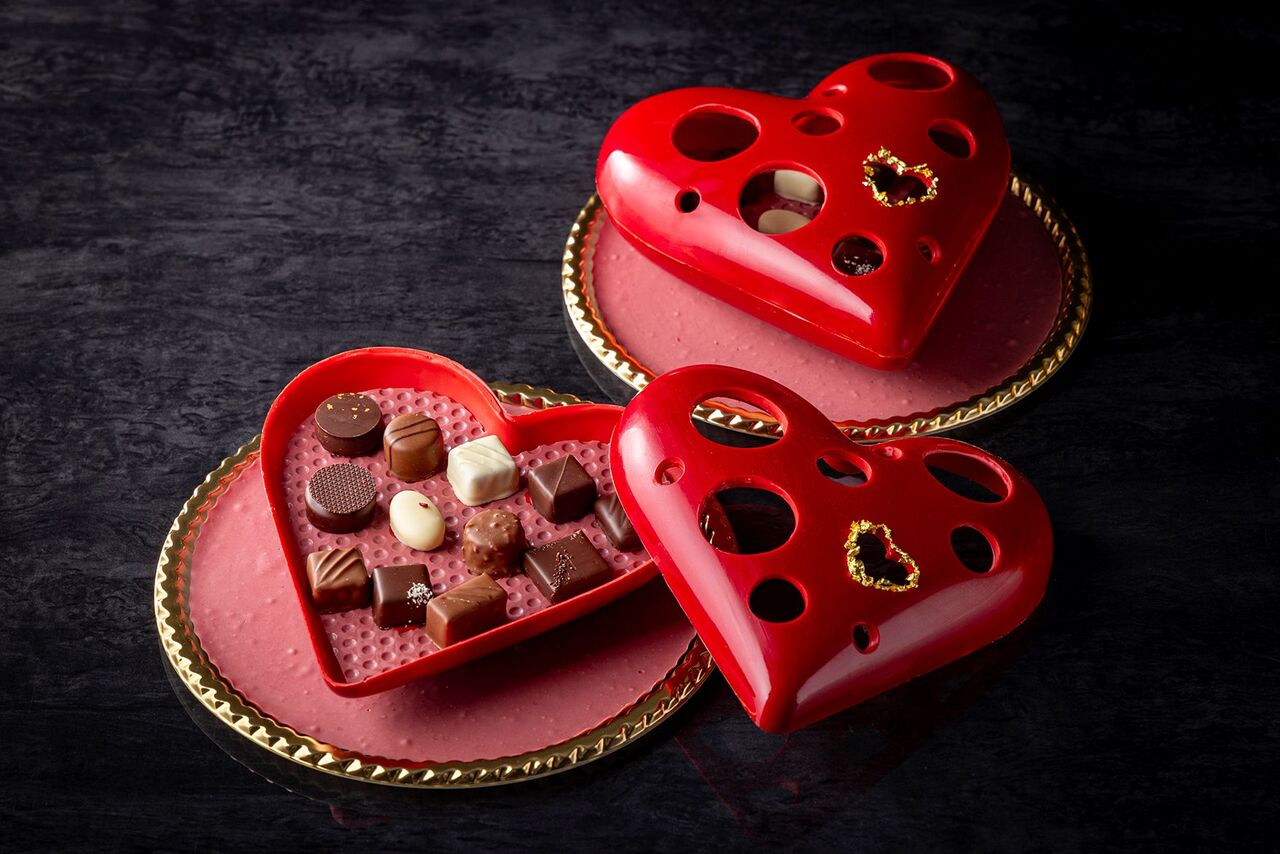 The heart is made with 35% Felchlin Opus White chocolate and the base is Barry Callebaut ruby chocolate, creating a flavor that combines a mellow richness with the fruity acidity unique to ruby, softly spreading throughout the mouth. The bonbons peeking out from the gaps in the heart and the sparkle of gold powder add a touch of elegance befitting a special gift.