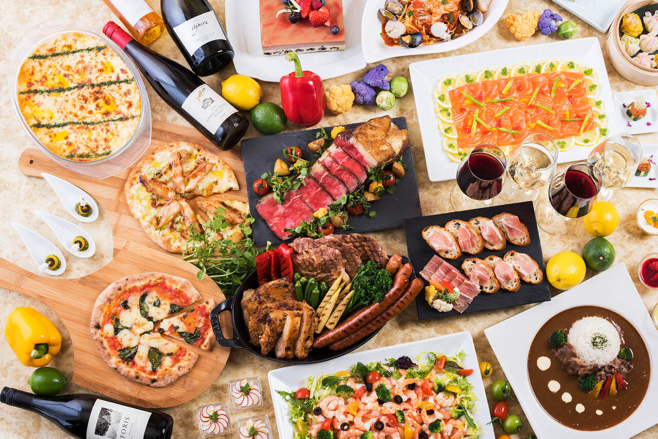 人気のローストビーフや窯焼きピッツァ、にぎり寿司など、前菜からデザートまで約60種類のメニューをお楽しみください。
