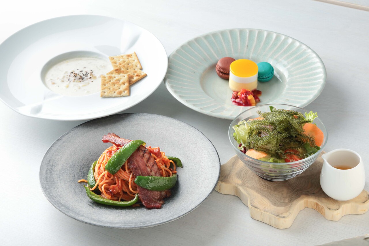 A set menu featuring the chef’s recommended pasta of the day, a choice of appetizer (sea grape salad or soup), and dessert.