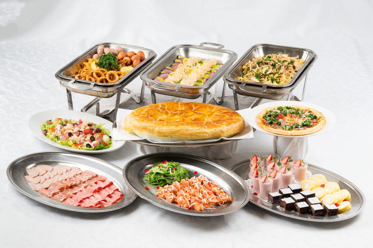 Cold buffet dishes, hot buffet dishes, assorted desserts