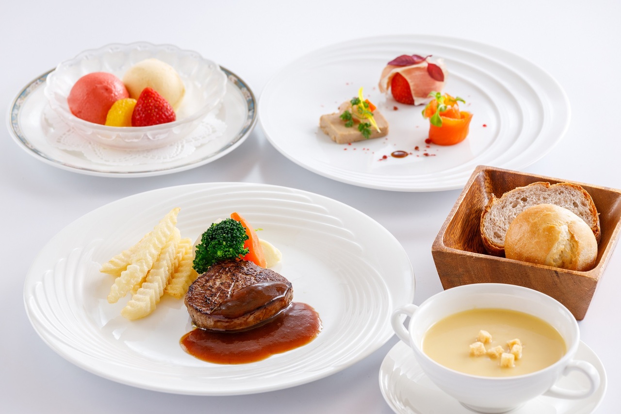サラダ・本日のスープ・国産牛フィレステーキ(100g)・ブレッド2種・本日のアイスクリーム&シャーベット・珈琲または紅茶