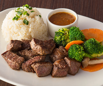 This is the steak lover’s steak. Well-marbled, juicy and savory Aussie ribeye steak. Served with butter rice, fresh veggies and Caesar salad.