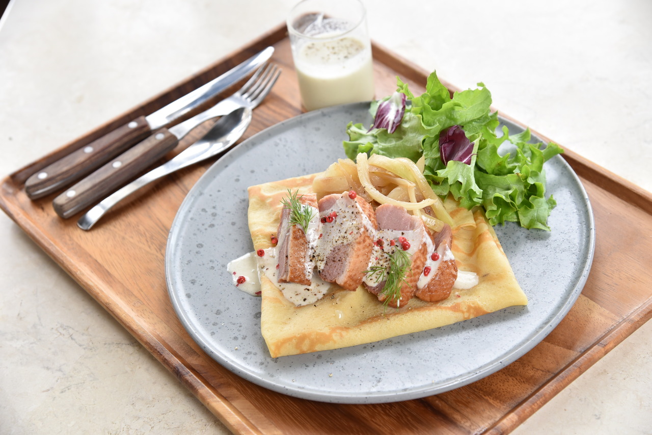 もちもちのクレープ生地に、ジョージアの伝統料理シュクメルリ風にアレンジした合鴨を合わせたROCCAオリジナルデリクレープです。