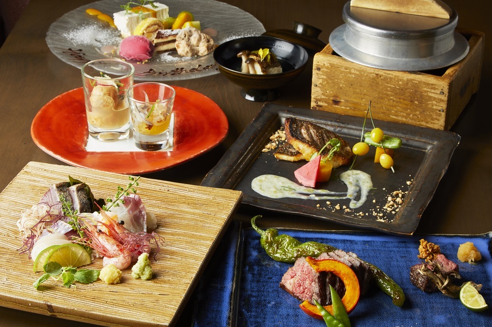 Iberico pig and seasonal seasonal food course skillfully incorporating Japanese and Western techniques