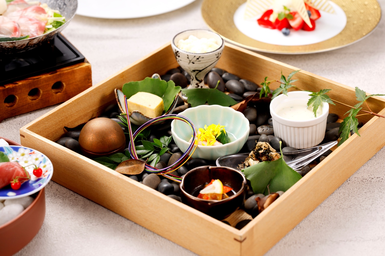 近江町市場直送の新鮮な海の幸。旬の加賀野菜。能登豚等伝統の中にも趣向を取り入れた北陸の美食をお愉しみください。