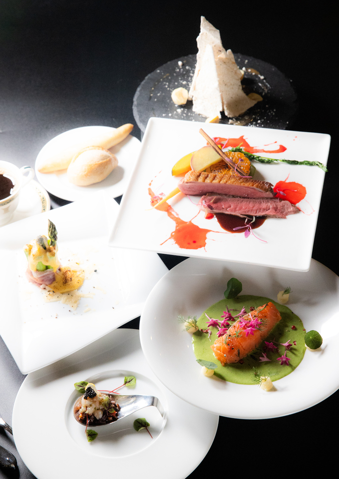 オープンキッチンの炭火で余分な脂を落としながら焼きあげ、肉の旨味を閉じ込めたメインディッシュ