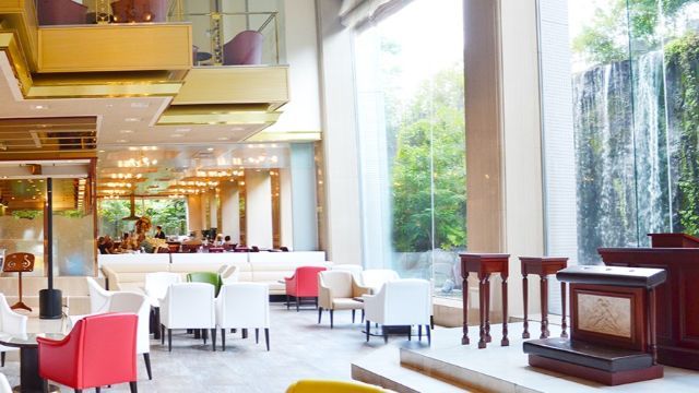 ホテル内にあるラウンジです。店内は、グランドピアノ、シャンデリア、デザイン性の高いソファーを取り揃えたおしゃれな空間。窓面からは、7mの高さから流れ落ちる滝、美しい庭園の景色が楽しめます。コーヒー、紅茶、ペリエなどのドリンクメニューほかに、芳醇な口当たりが楽しめるフルーツジュースも取り入れています。お酒もご用意していますので、お好みのドリンクを味わいながら、安らぎの時間をお過ごしください。