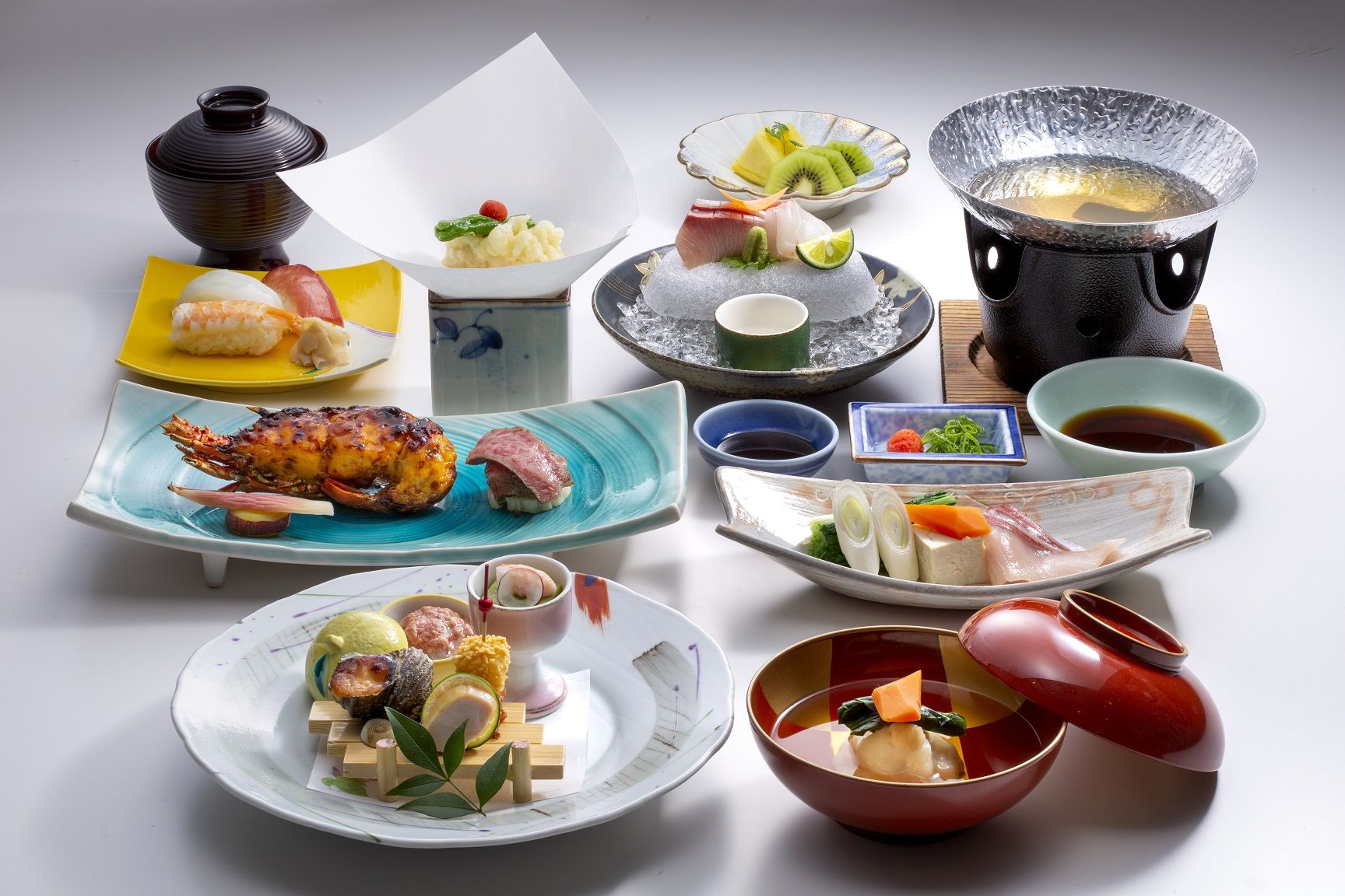 Sashimi 3 types of hassun Small dishes Stewed dishes Fried dishes Grilled dishes Vinegared dishes Meat dishes Salad ・・・・・・・・・ Rice Fish soup Pickles Chawanmushi (savory steamed egg custard) Sweets