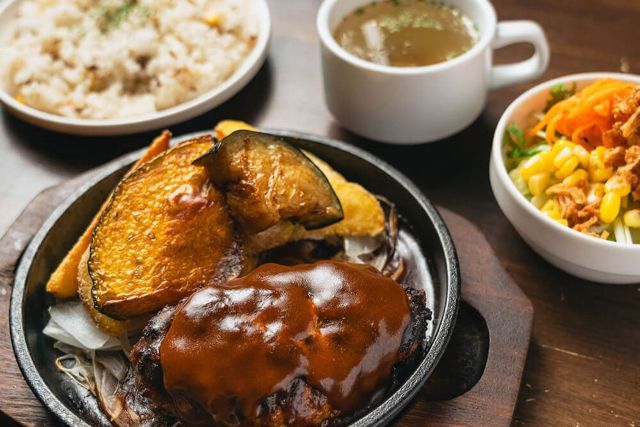 Enjoy the best of both! ♠️ Luxurious tapas with Kobe Beef A5 teppan steak (100g) & Japanese-style hamburger steak ♠️ Includes appetizer assortment, soup, salad, pilaf, white rice or bread, and dessert. ◎ Can be changed to a premium lean steak or a marbled (fatty) steak.