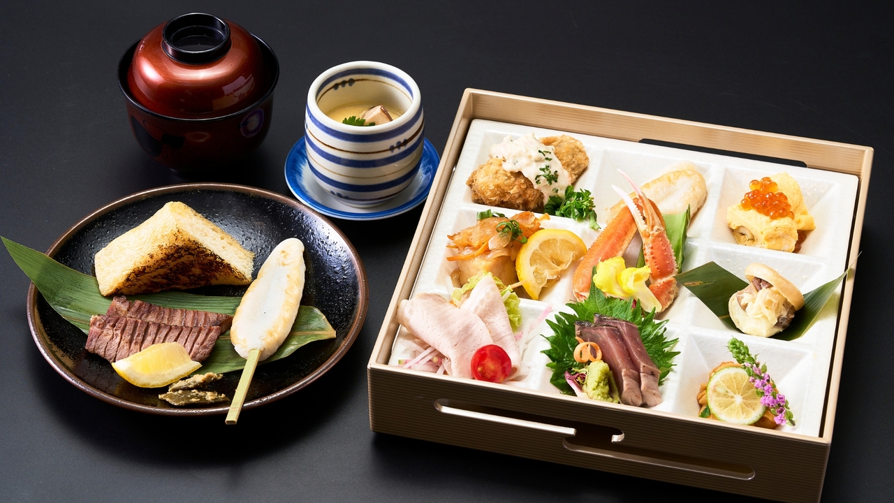 名物「牛タン炭火焼」や三陸の「大粒牡蠣フライ」「鰹のタタキ」など、山と海の幸を贅沢に集めています。
