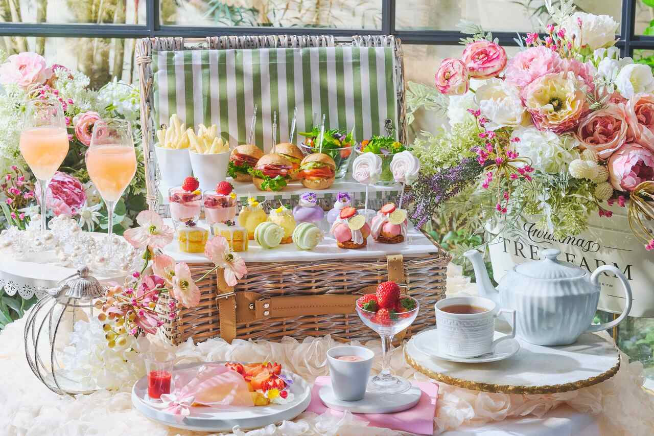 パステルカラーの花々が咲くフラワーマルシェと彩り豊かな果実が春の陽だまりを連想させるアフタヌーンティー