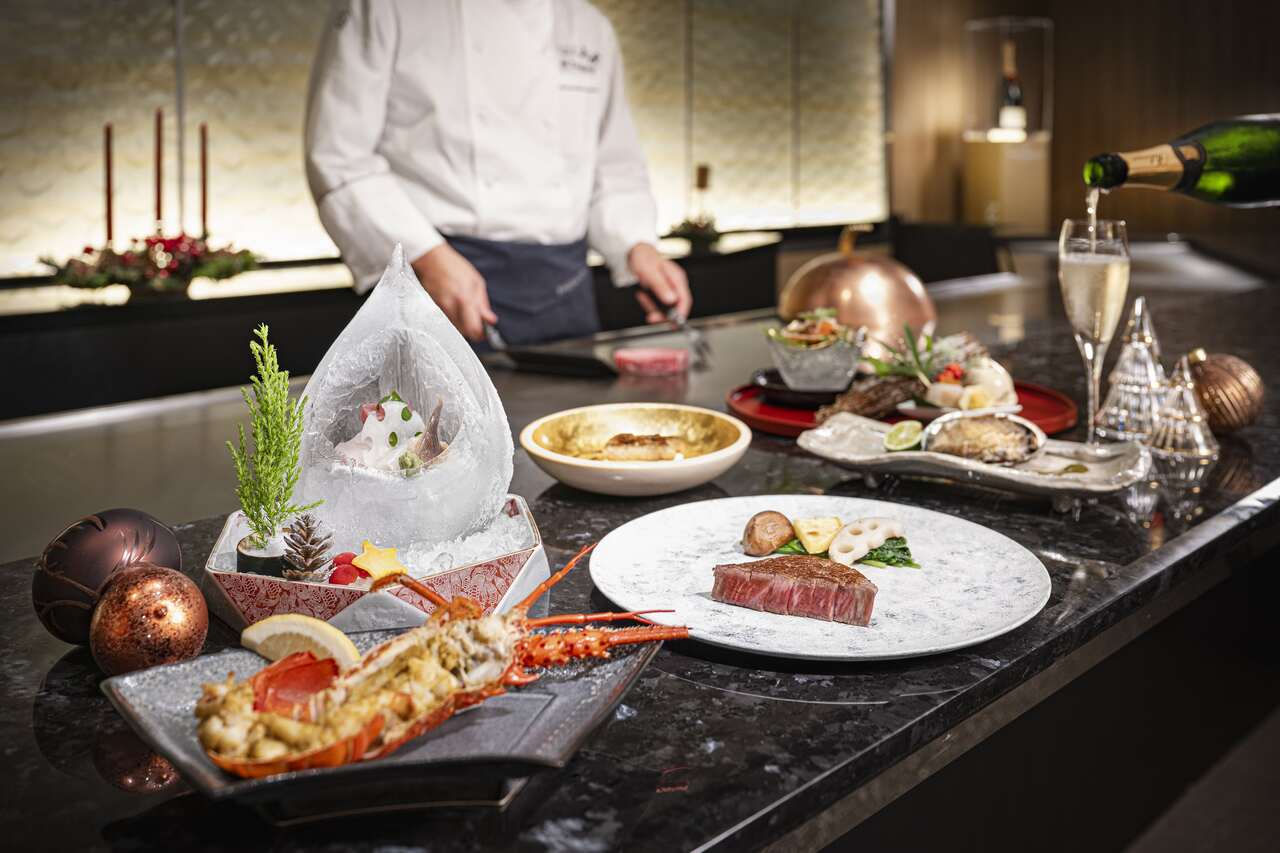 鉄板割烹「山吹」では、クリスマスディナーに松坂牛やフォアグラをご用意し、木の花オリジナルの氷の器に盛り付けた造里や、目の前で焼き上げる鮑など、特別な夜にふさわしい逸品をご提供いたします。