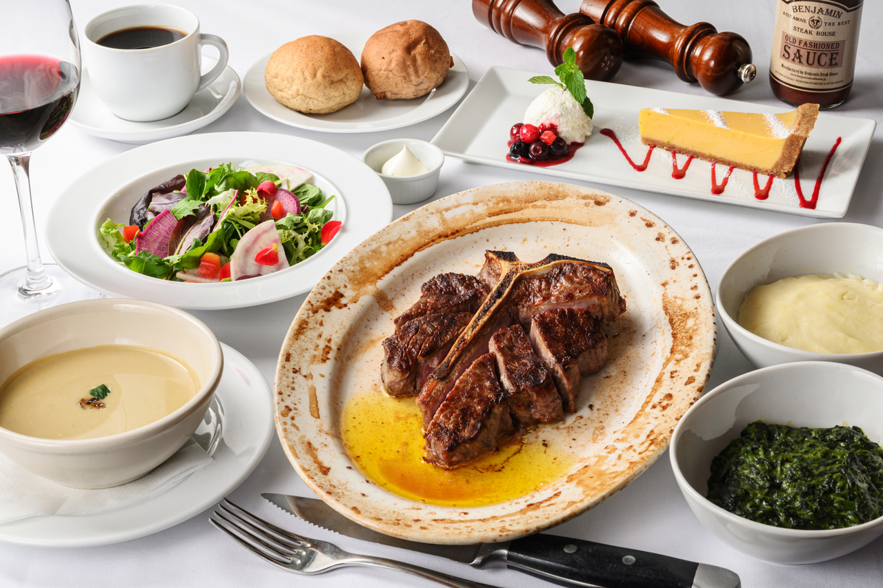 All-you-can-drink included. Eight items featuring an aged T-bone steak, two popular side dishes, and a dessert to finish.