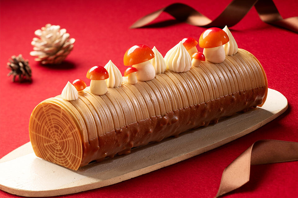米粉と栗粉を使ったしっとり生地に、自家製マロンコンポートとバニラクリームを巻き込んだブッシュ・ド・ノエル。愛媛県産「中山栗」のモンブランクリームをまとわせ、トップにはバニラやブロンズチョコレートのクリーム、きのこをモチーフにした愛らしいチョコレート細工をあしらいました。