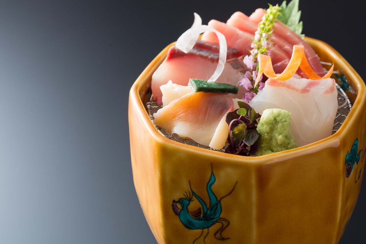 Amuse and sashimi, simmered dish, steamed dish, vinegary dish,