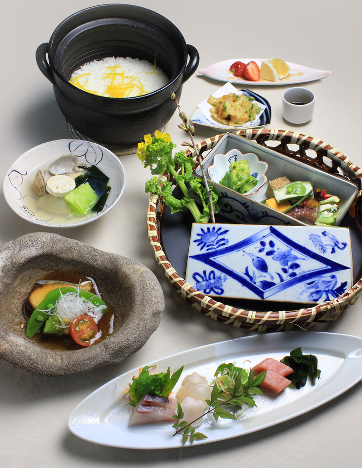 約15種類の季節の旬を一籠に詰め込み、炊き立ての釜ご飯と一緒にお召し上がりいただけます。