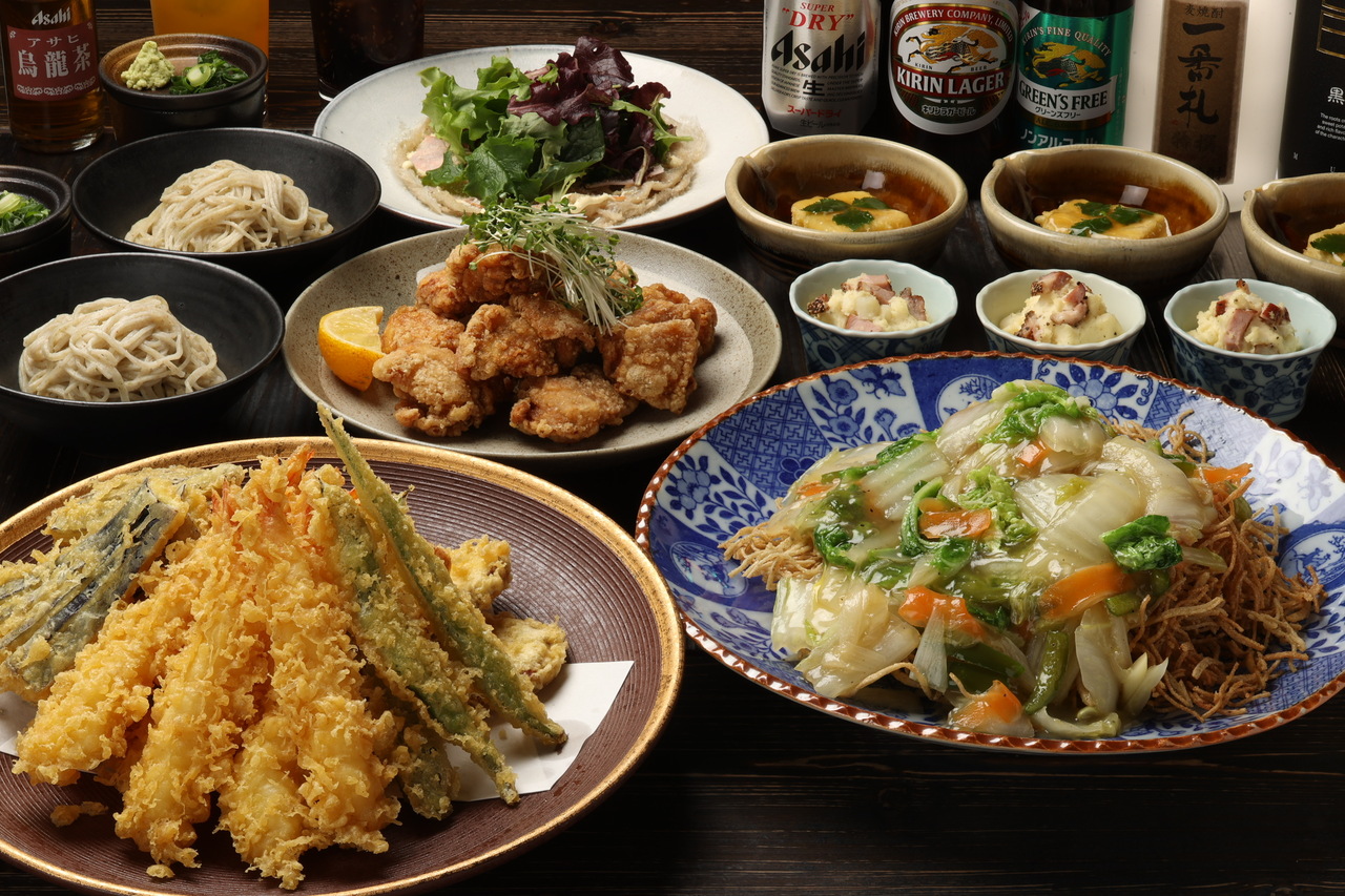 ざるそば、季節の天ぷら、ごま豆腐、丹波篠山の黒豆の炊いたん、里芋ぼーる、小鉢2品、かやくご飯、漬物、そばプリン
