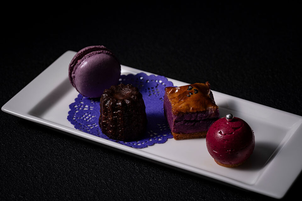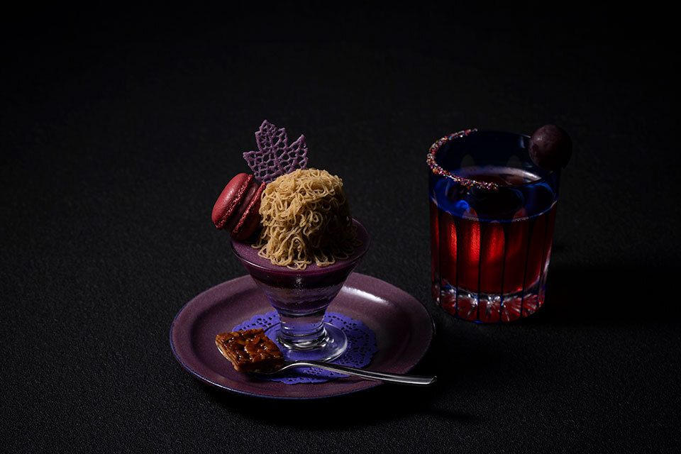 A photogenic Mont Blanc parfait finished with “Yume Silk” sweet potato cream. Paired with a fruity cocktail infused with grape and blueberry. This charmingly beautiful set is packed with the flavors of late autumn—please enjoy this seasonal special.