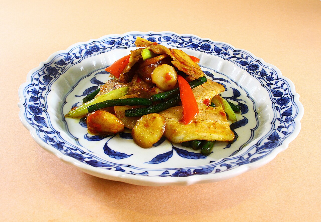 四川省で愛されている鶏肉の炒めを県産地鶏「富嶽白鶏」で仕上げました。芽菜(ヤーツァイ)の独特な味わいをサンチュに包んでお召し上がりください。
