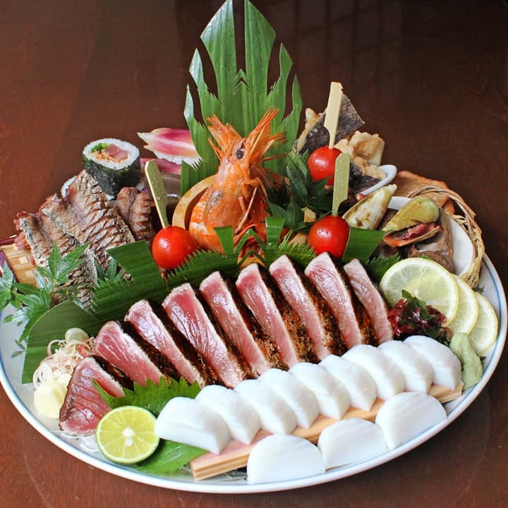 大皿に溢れんばかりに盛込まれた海の幸・山の幸。これぞまさしく高知を代表する郷土料理、皿鉢料理です。宴会好きの人間が集まれば必ずと言っていいほど出てくるのがこの皿鉢料理。