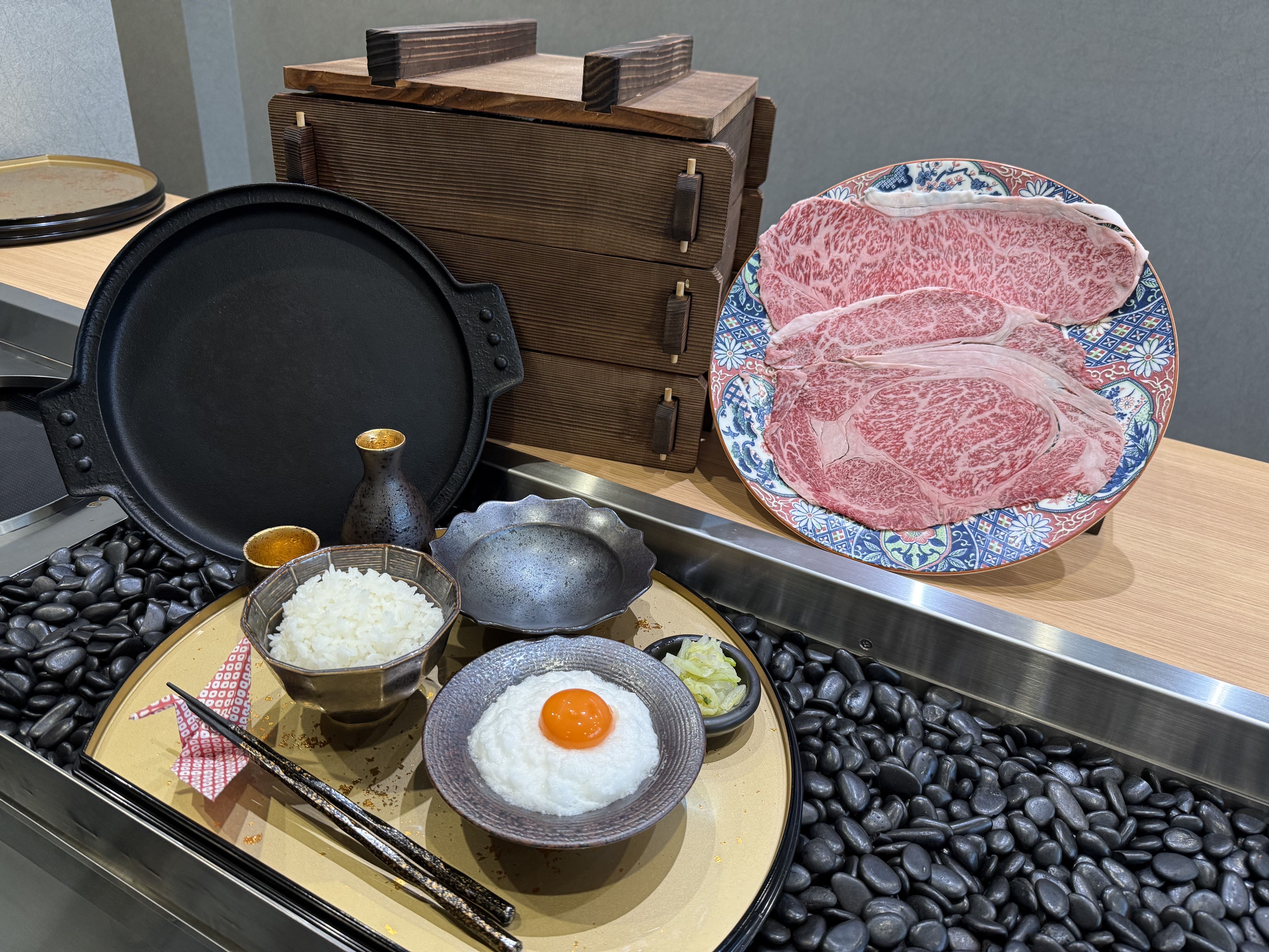 Two sirloins and two ribeye steaks. Enjoy the finest Wagyu beef, carefully selected through extensive meat research. The rice, hand-picked by the chef himself, is exquisite. The fluffy, meringue-like egg is the perfect complement to the richly seasoned yakisuki.