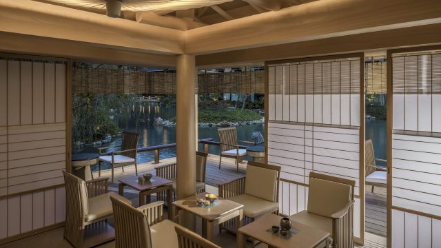 "Kaedeju" is a lounge where you can enjoy the beautiful scenery of Kyoto. The interior is a fusion of traditional Japanese elements and modern design, creating a calming atmosphere. From the large windows, you can enjoy the scenery of the four seasons, and the space spreads out in harmony with the garden outside. It is a place where you can spend a luxurious time in silence.
