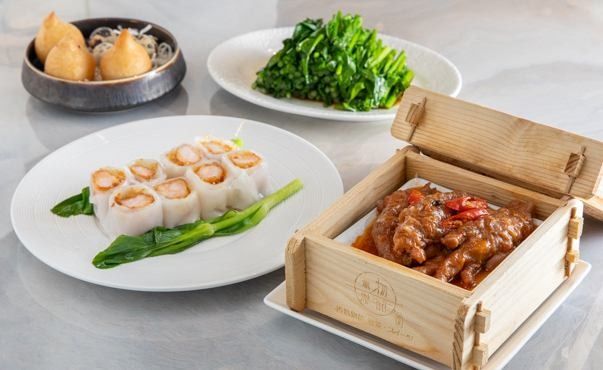 Assortment of four kinds of appetizers Chili shrimp or shrimp mayo (optional) Hong Kong-style sweet and sour pork with black vinegar Simmered whole shark fin Rice with shark fin XO stir-fried water spinach Dim sum Dessert