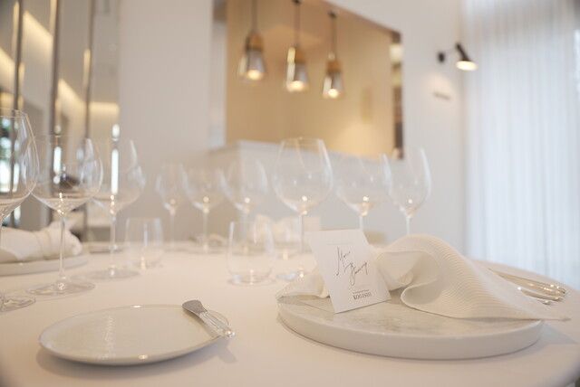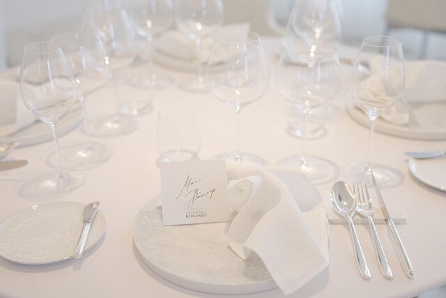 店内に足を踏み入れると、そこは白とグレーを基調としたモダンな空間。テーブル席と個室を用意し、福岡の食材を使ったランチやディナーを提供しています。メニューには肉や魚を使ったフレンチ、ディナーにはトリュフなどの高級食材を使ったメニューがございます。ドリンクには、緑茶などのソフトドリンク、フランス産や国産ワインなど種類が豊富にございますので、一緒にお楽しみください。