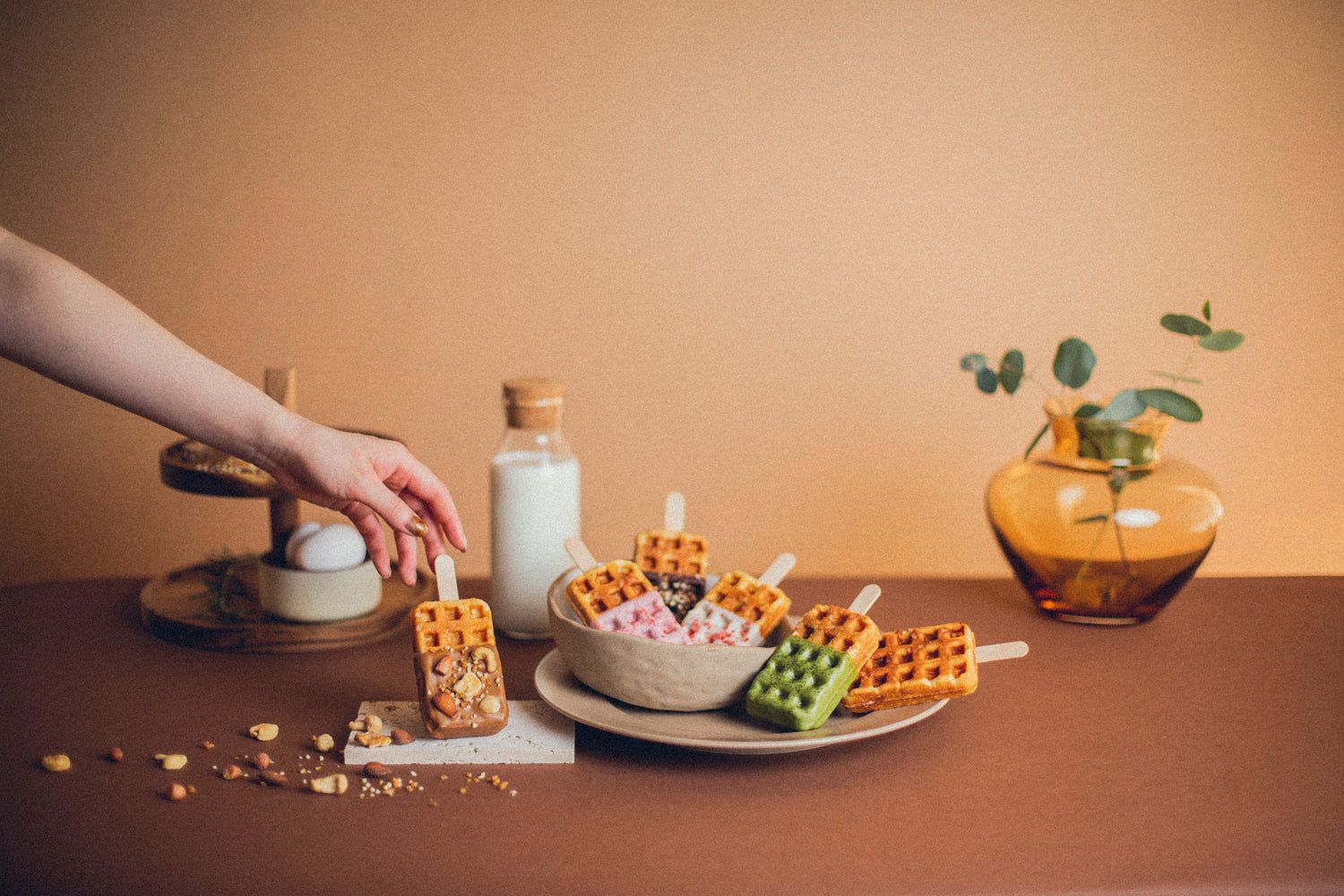 ヴィンテージ家具が置かれた店内で、さまざまなフレーバーのワッフルとドリンクを提供