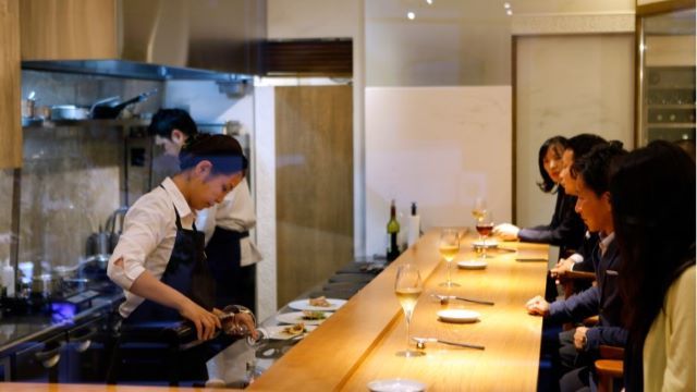 外の明るい光が差し込む店内には、解放感あるオープンキッチンを囲むカウンター席があります。大きな窓から見える景色で季節を感じながら、福岡を中心としたお野菜とお魚を楽しむことができます。長崎県対馬ジビエやヨーロッパの高級食材を使い、季節ごとに組み立てられたお料理の数々をご提供。素材のおいしさを引き立てるソースにもこだわっています。シェフのこだわりがつまったシンプルかつ奥深いお料理をお楽しみください。