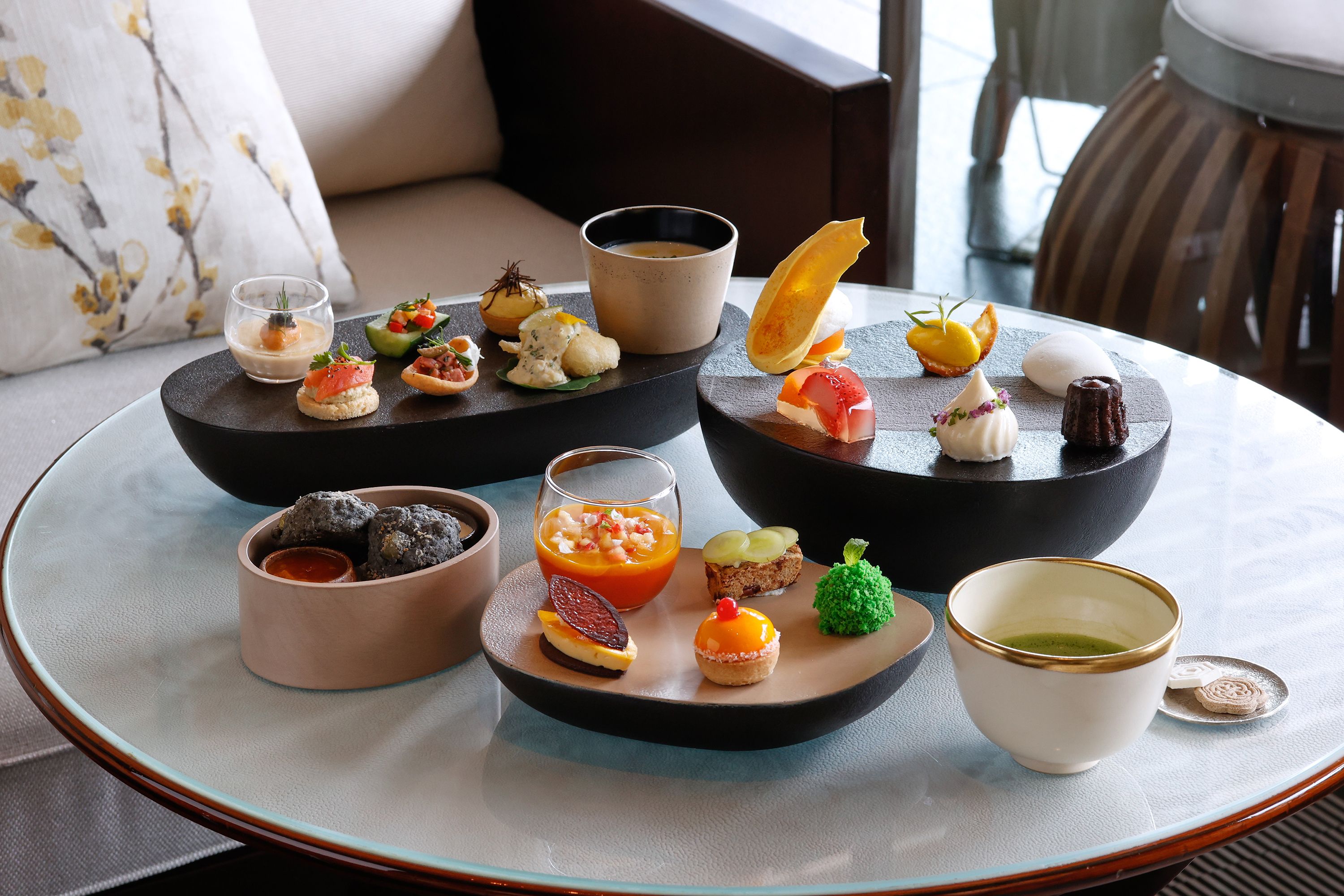 The Palace Lounge offers a luxuriously cozy and convivial setting – whether for cocktails or afternoon tea. By day, kimono-clad staff serve afternoon tea, an exquisite affair presented on lacquerware ‘Stones’ handcrafted from wood, with seasonal savory and sweet items. Sunset cues the space’s transformation into a lively champagne & cocktail lounge with live Jazz accompaniment each evening.