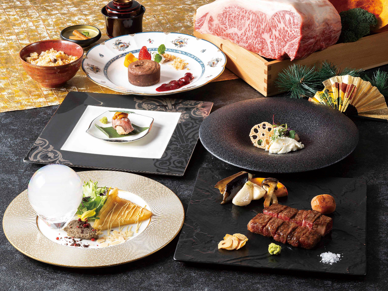 [Amuse-bouche] Composition of golden-eyed snapper and sea urchin [Hors d'oeuvre] Confit of duck with Aigle Douce sauce [Hot hors d'oeuvre] Flounder wrapped in cartafata, Rishiri kelp larme [Fish dish] Sautéed spiny lobster with fresh Italian caviar cream sauce [Main dish] Teppanyaki of pomme duchesse and Kishu Nankou plums Special brand beef fillet Rossini style [Meal] Garlic rice made with Japan's best eggs, miso soup, pickles [Dessert] High cacao chocolate mousse A gift from the pastry chef After-meal drink