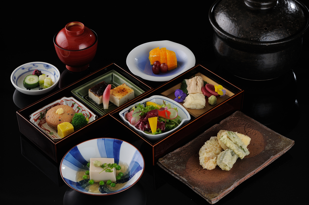 The menu features small portions of delicious food, mainly ingredients from Okayama and the Seto Inland Sea, presented in colorful small bowls and presented in gorgeous lattice wooden boxes.