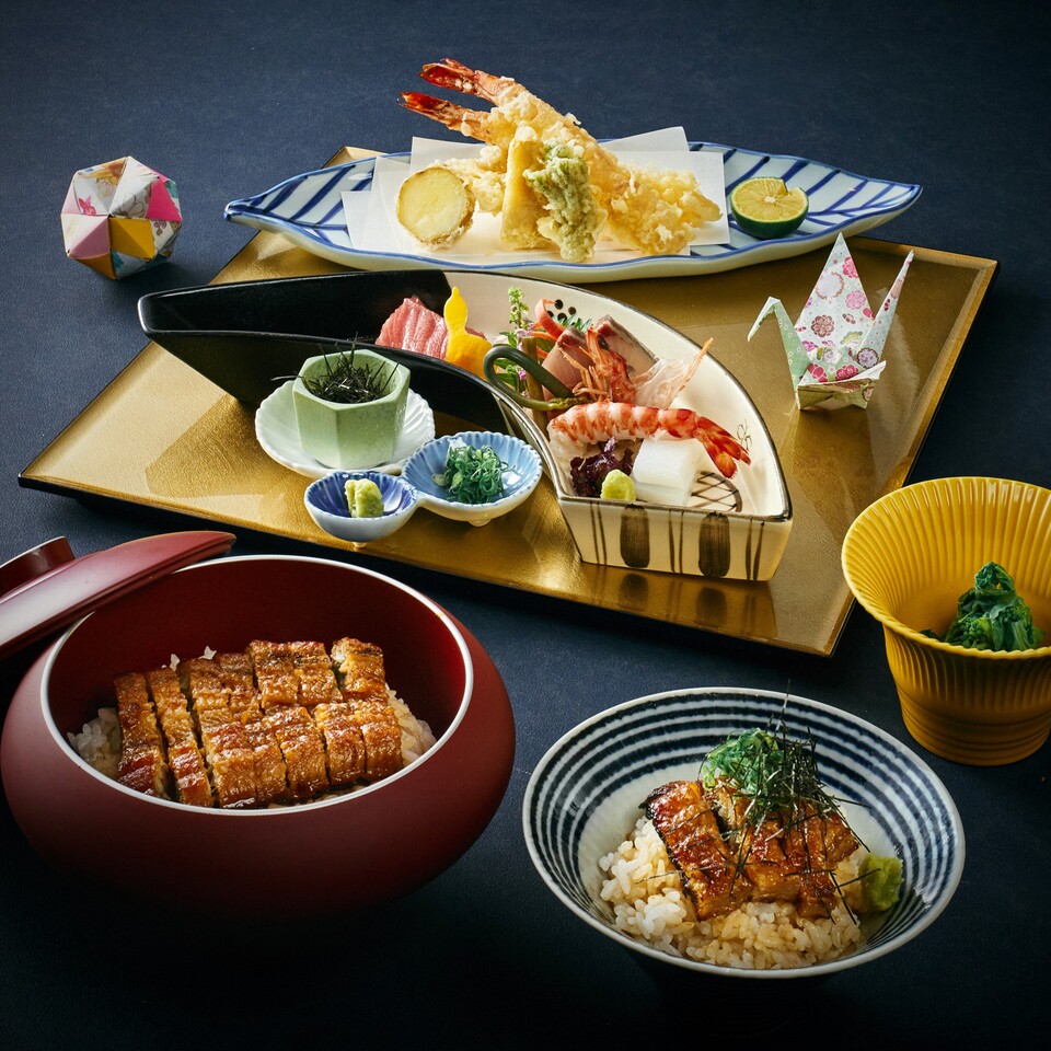 [Food contents] Small dish, assortment of five kinds of seasonal sashimi, garnish set, fried food, assortment of seasonal tempura, meal, eel hitsumabushi, soup, miso-style