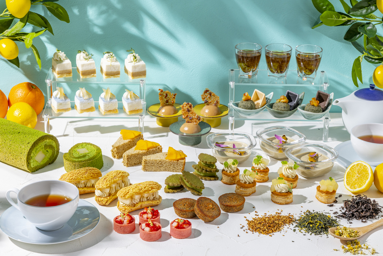 The buffet offers a diverse lineup of over 10 varieties, combining sweets made with aromatic tea leaves such as matcha, jasmine, osmanthus, butterfly pea, and hibiscus, with seasonal fruits like mango, white peach, strawberry, and lychee.
