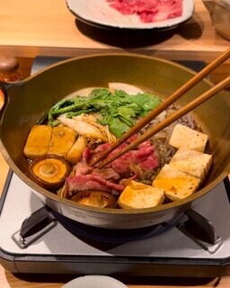 - Sukiyaki (hot pot) with Gassan Wagyu beef raised in Nishikawa