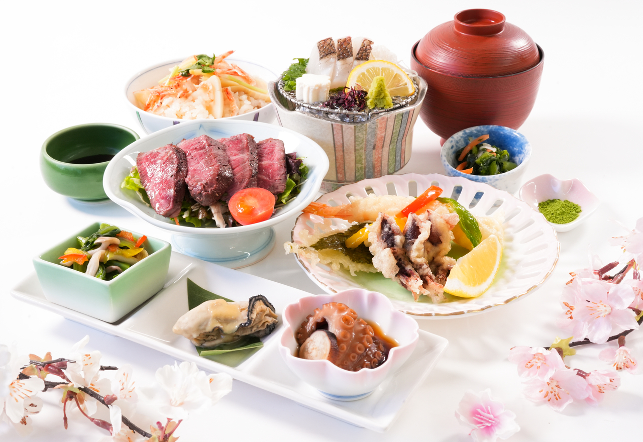 かきフライ、刺身、国産牛ステーキ、茶わん蒸し、穴子飯、汁、香の物