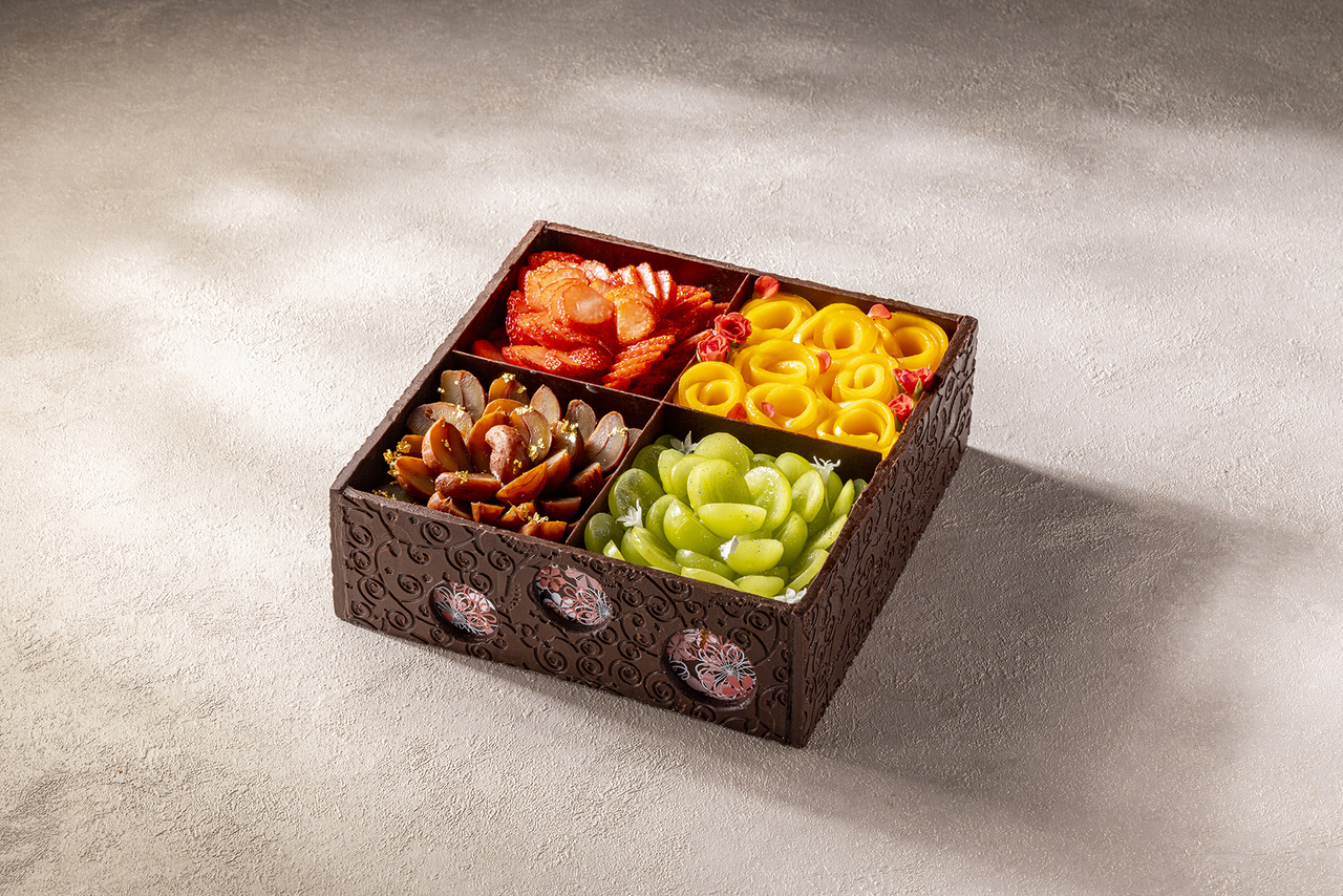 This exquisite cake is made with generous amounts of carefully selected ingredients and finished in vibrant colors. Open the luxurious box crafted from Belgian chocolate to reveal four vibrantly colored cakes. These cakes are generously crafted with ingredients found only in the world, including Sakura Momo Ichigo, Amarin, and the rare Silver Mango, only available in winter. Furthermore, the skill of our pastry chefs, who maximize the power of the ingredients, such as additive-free eggs and cultured butter, makes for a one-of-a-kind Christmas cake.