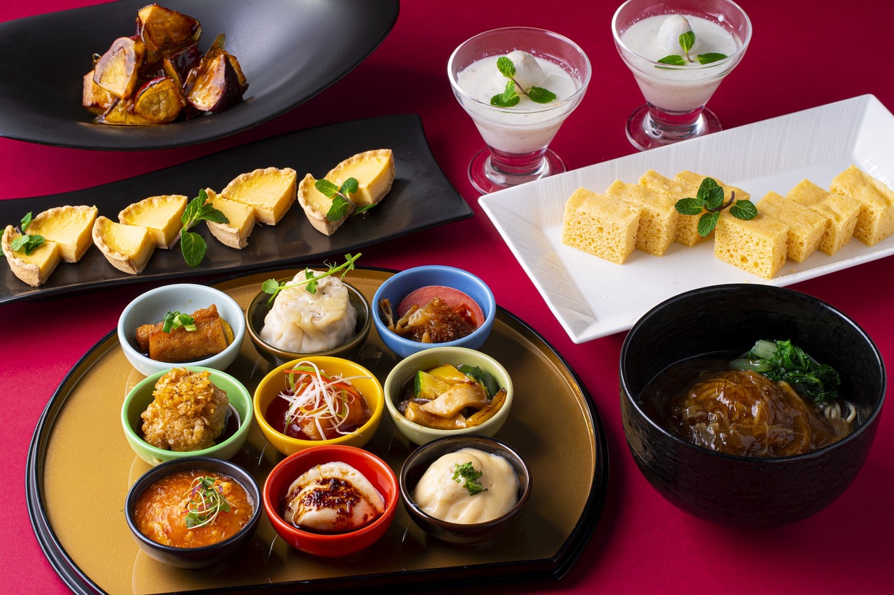 サラダ、点心2種、メイン2品、ご飯&スープ または お粥、デザート