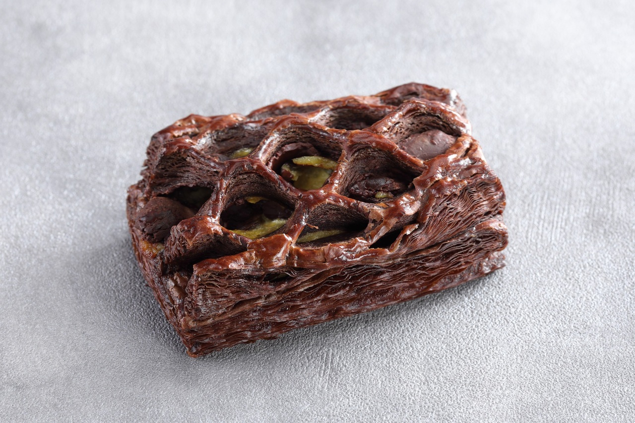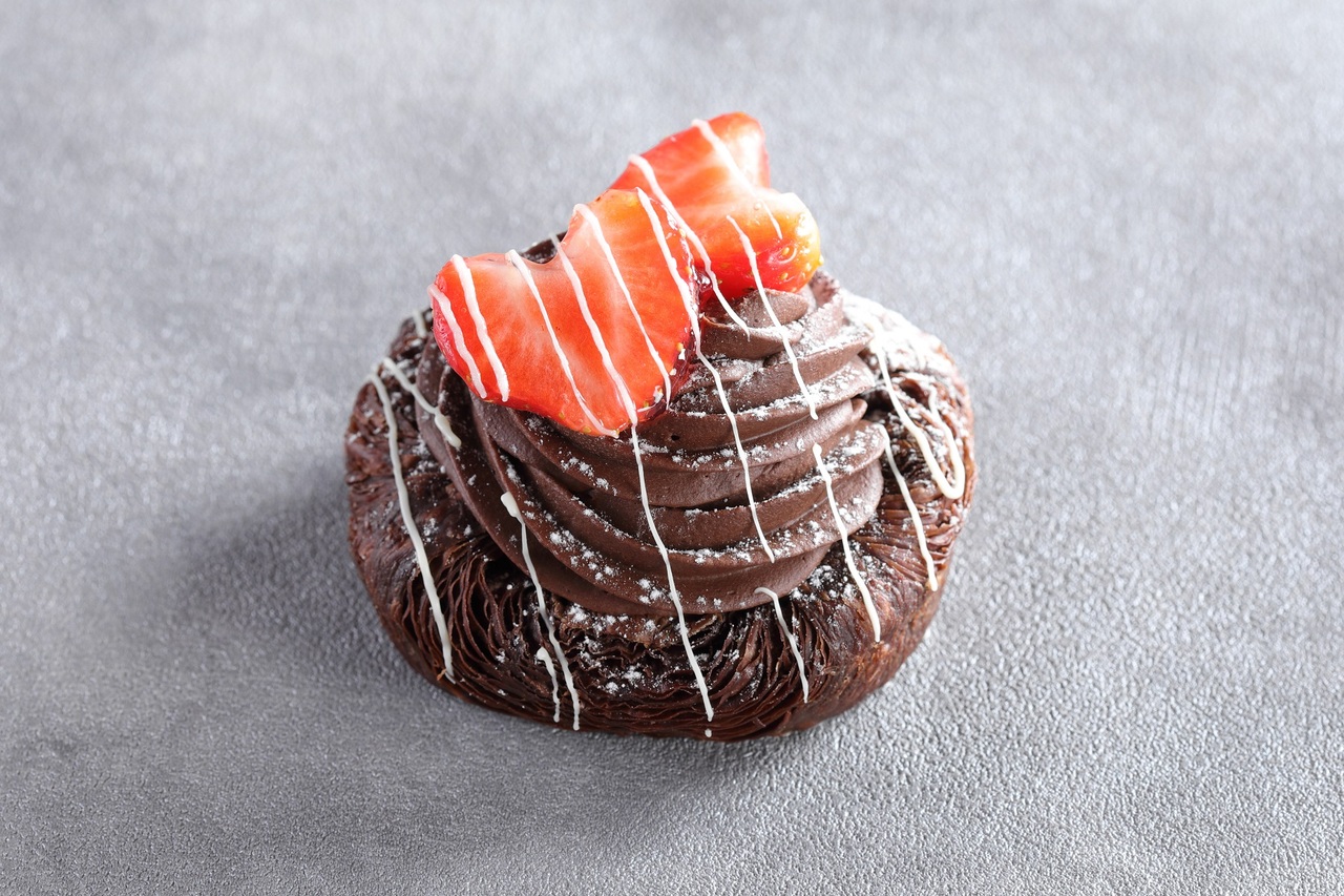 いちごフレーバーのチョコレートをコーティングしたバニラムースの中に、いちごソース、ライムのムース、いちごの果肉入りジュレを重ねました。いちごの甘酸っぱさとライムの酸味が効いた、爽やかな味わいのムースケーキです。
