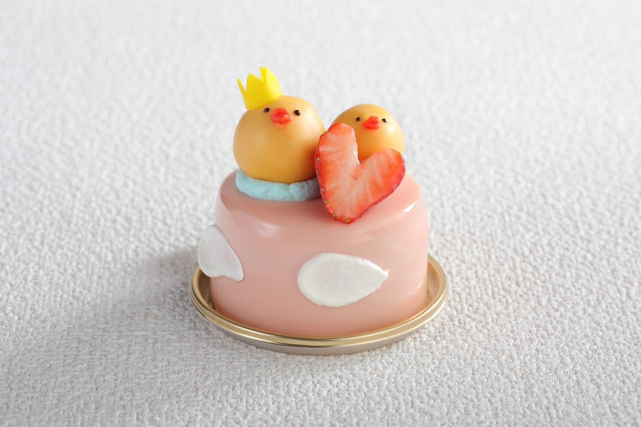 ひよこがキュートなパステルピンクのムースケーキ。ベリーのムースとジュレをいちごのムースで包み込み、ひよこに見立てたミニケーキといちごをトッピングしました。
