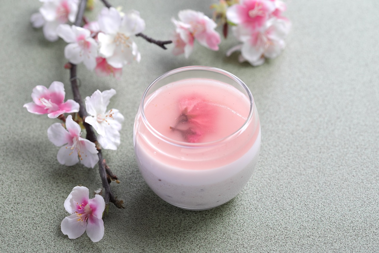 小倉あんの甘みと塩漬けした桜の花のほのかな塩味が絶妙な、日本茶との相性も良い和テイストのブラン・マンジェ。小倉あんのムース、桜のブラン・マンジェ、いちごのジュレを層にし、桜の花の塩漬けをトッピングしました。