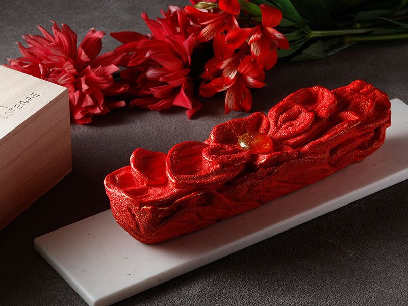 “サンタクロースの一休み”をテーマに、心温まるクリスマスの情景を描いた特別なケーキ。白樺の切り株を模したチョコレートの箱を開けると、甘酸っぱい苺のタルトにフランボワーズ風味のチョコレートのシュークリームをツリーのように仕立てた華やかなタルトケーキが姿を現します。