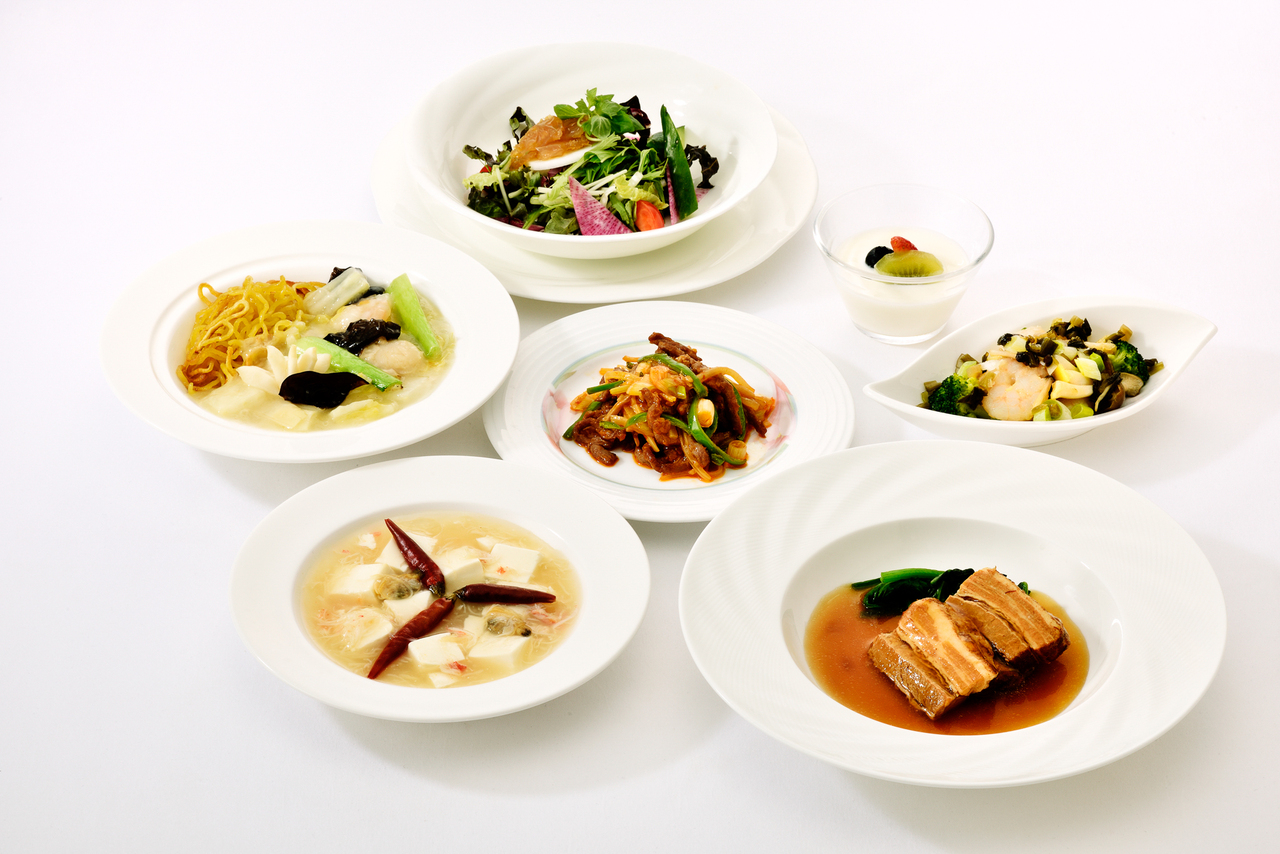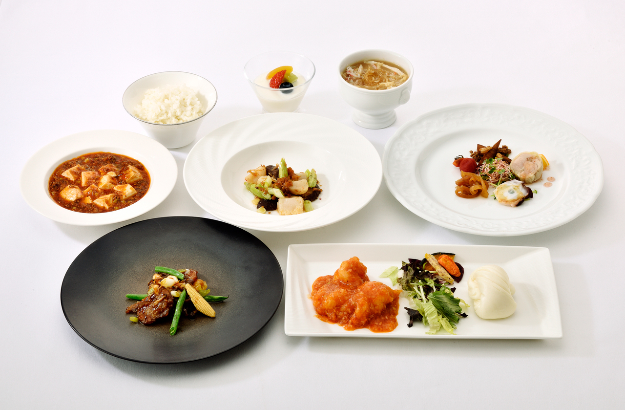 お好きな料理に、 麺料理と麻婆豆腐、デザートなどがついたランチセットです。