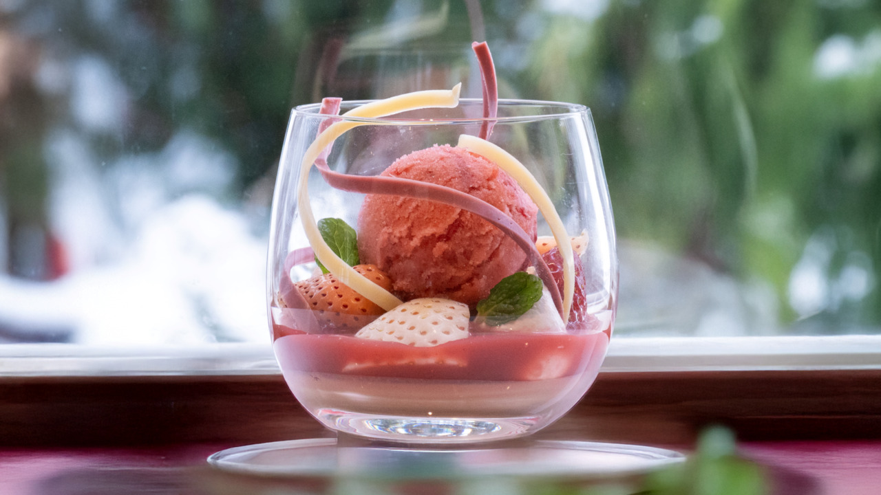 ストロベリーフェアシリーズ。バローナ社のチョコレートを使ったなめらかなパンナコッタに、香り高い古都華苺のソルベを添えた季節限定の苺パフェ。グラスの中には苺ソースと苺のマスカルポーネムースを忍ばせ、層ごとに広がる甘酸っぱさを楽しめます。