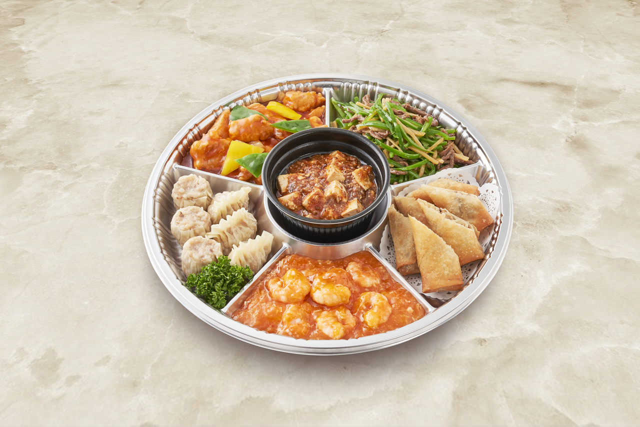 海老のチリソース・牛肉とピーマンの細切り炒め・酢豚・麻婆豆腐(四川風)・春巻・海老入り焼売・フカヒレ入り蒸し餃子 の4~5名様向けのセットです。