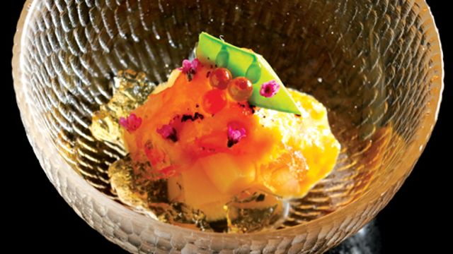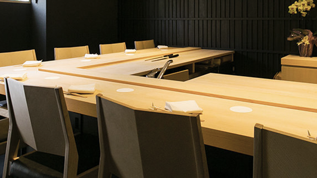 黒を基調とした店内は、プライベートな時間を楽しめる居心地の良い空間。季節やその日の気候によって食材を変える、大将こだわりの江戸前鮨を提供しています。素材の味だけでなく、見た目にもこだわった色鮮やかな料理をご堪能ください。旬魚の握りはもちろんのこと、新鮮な野菜や魚を使った焼き物や温物といった和の料理もご用意。脂ののった鮨に合うワインや日本酒などもお楽しみいただけます。