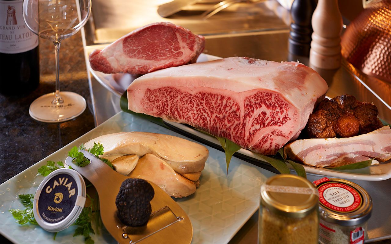 ・Wild Tiger Pufferfish Carpaccio Pork and Risveau Country Pâté Lobster Cream Croquette Foie Gras and Sweet Potato Teppanyaki with Espresso Sauce or Swiss Raclette Cheese, Salsiccia, and Inca Awakening